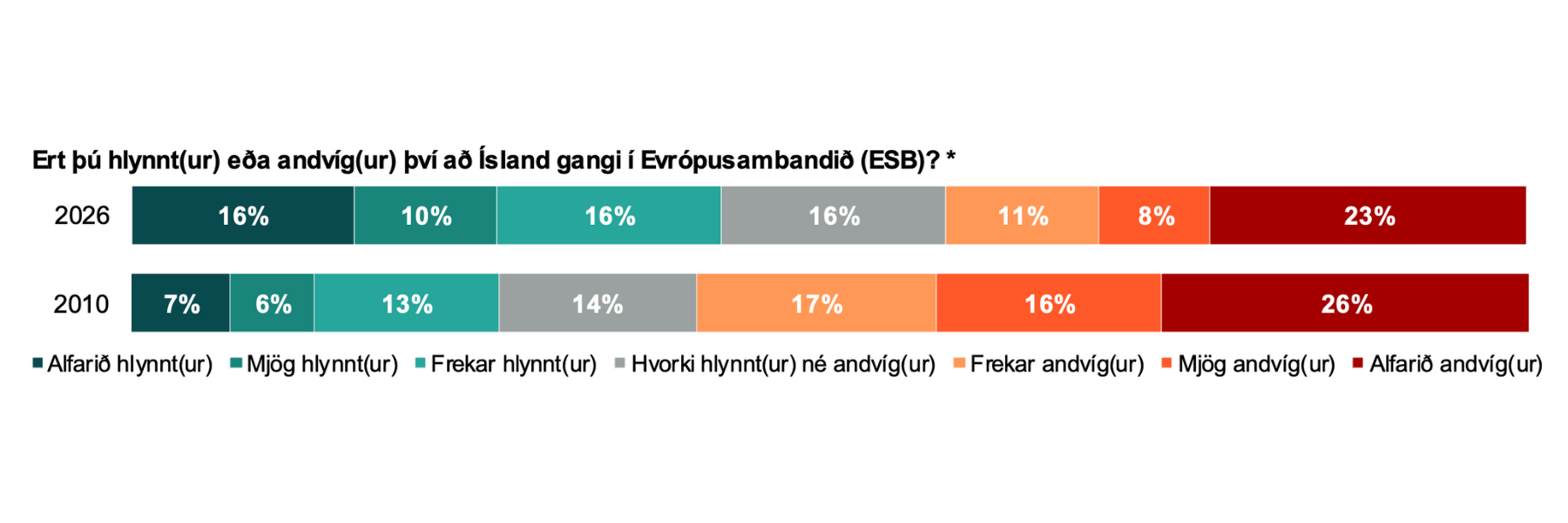 En rýnum í tölurnar. Það hafa aldrei fleiri verið Alfarið hlynntir því að ganga í ESB. Þegar við fórum síðast í gegnum aðildarumsókn, árið 2010, voru 7% Íslendinga alfarið hlynntir og 26% jákvæð í heildina. Þá voru 26% Alfarið andvíg og 59% neikvæð.